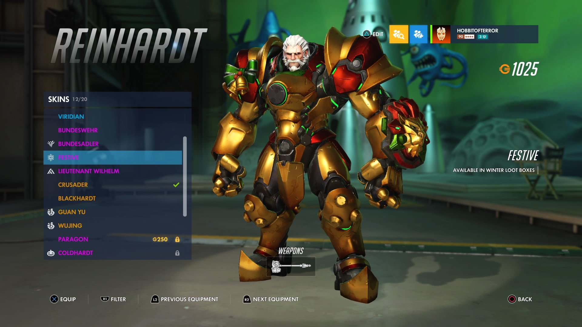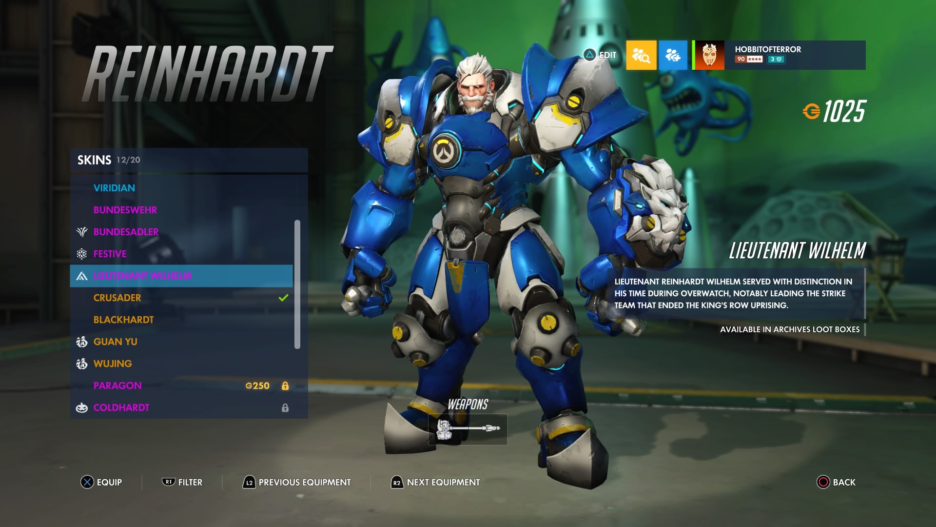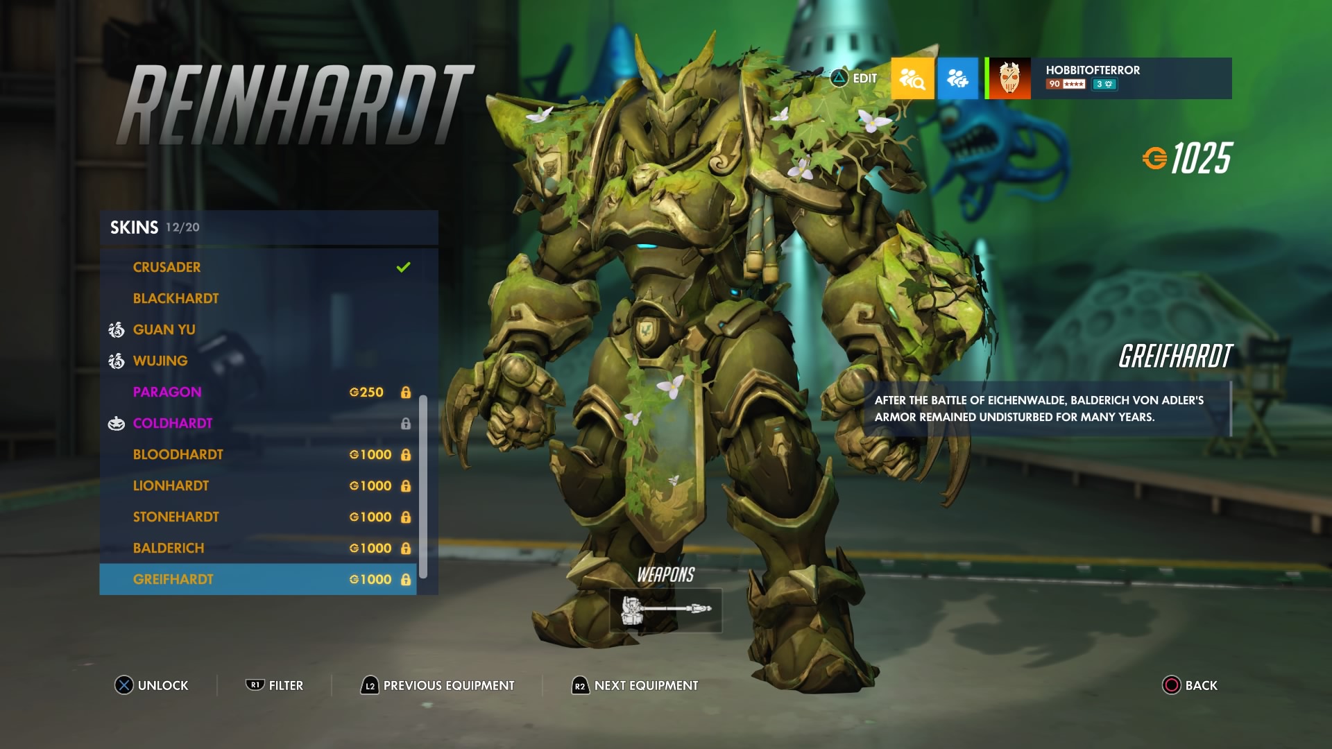 - It is his second (and his most expensive) canon skin out of his roster. And thanks to this skin we get to see what Reinhart looked like when he was a Crusader in his homeland of Germany before joining Overwatch.